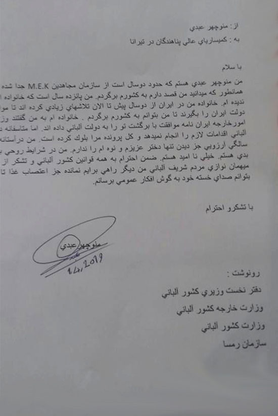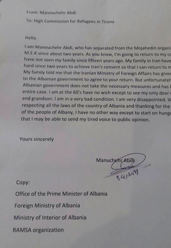Berisha’s successor, the current Prime Minister Edwin Rama, is doing exactly the opposite. The Albanian authorities are hindering Manoucher’s return to the bosom of his family in Iran. Despite his repeated requests, Manoucher is prevented from returning to his homeland just to fulfil a whim of Maryam Rajavi, leader of the MEK cult organization. To this arbitrariness of the Albanian government, Manoucher has responded with the only tool that he has: a hunger strike. With a letter to the UNHCR, the Foreign Ministry of Albania, the Albanian Interior Ministry and Prime Minister Rama on 1 April 2019 he has informed them of his decision to start a hunger strike in order to persuade the Albanian government to allow him to return to his family home in Iran.