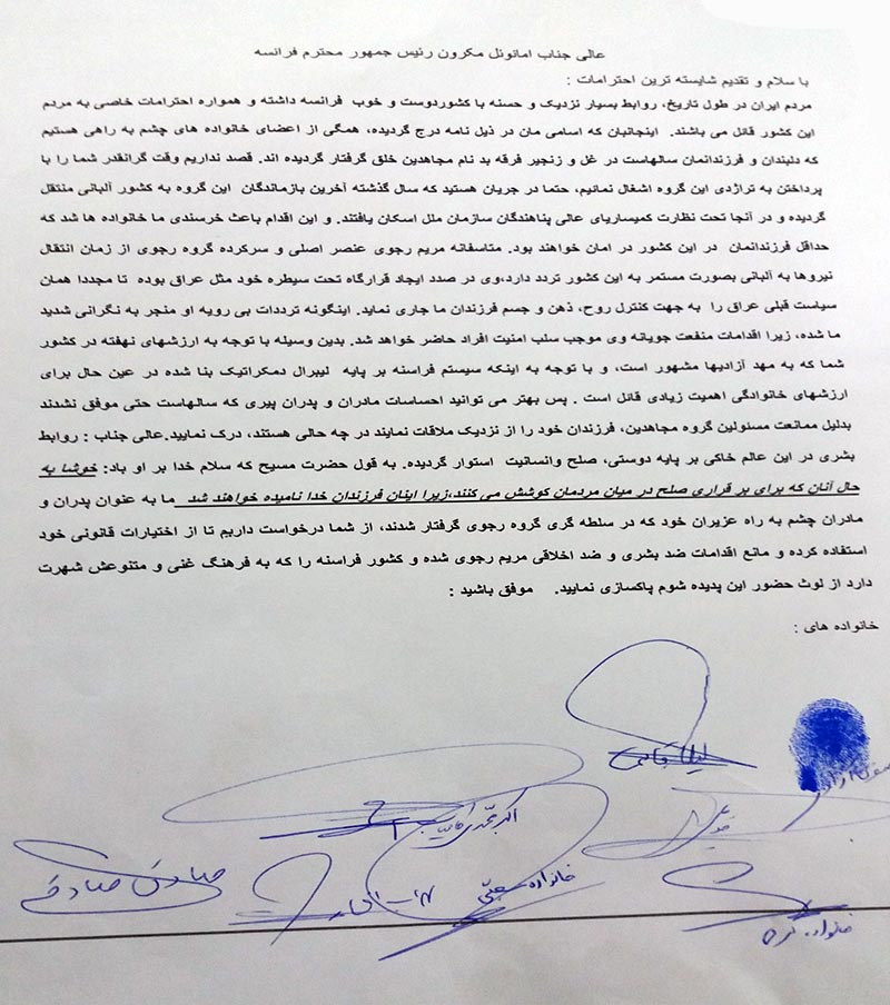 مردم ایران در طول تاریخ، روابط بسیار نزدیک و حسنه با کشور دوست و خوب فرانسه داشته و همواره احترامات خاصی برای مردم این کشور قائل می باشند. اینجانبان که اسامی مان در ذیل نامه درج گردیده، همگی از اعضای خانواده های چشم به راهی هستیم که دلبندان و فرزندانمان سالهاست در غل و زنجیر فرقه بد نام مجاهدین خلق گرفتار گردیده اند. قصد نداریم وقت گرانقدر شما را با پرداختن به تراژدی این گروه اشغال نمائیم، حتما در جریان هستید که سال گذشته آخرین بازماندگان این گروه به کشور آلبانی منتقل گردیده و در آنجا تحت نظارت کمیساریای عالی پناهندگان سازمان ملل اسکان یافتند. و این اقدام باعث خرسندی ما خانواده ها شد که حداقل فرزندانمان در این کشور در امان خواهند بود. متاسفانه مریم رجوی عنصر اصلی و سرکرده گروه رجوی از زمان انتقال نیروها به آلبانی بصورت مستمر به این کشور تردد دارد، وی در صدد ایجاد قرارگاه تحت سیطره خود مثل عراق بوده تا مجددا همان سیاست قبلی عراق را به جهت کنترل روح، ذهن و جسم فرزندان ما جاری نماید. اینگونه ترددات بی رویه او منجر به نگرانی شدید ما شده، زیرا اقدامات منفعت جویانه وی موجب سلب امنیت افراد حاضر خواهد شد. بدین وسیله با توجه به ارزشهای نهفته در کشور شما که به مهد آزادیها مشهور است، و با توجه به اینکه سیستم فرانسه بر پایه لیبرال دمکراتیک بنا شده در عین حال برای ارزشهای خانوادگی اهمیت زیادی قائل است. پس بهتر می توانید احساسات مادران و پدران پیری که سالهاست حتی موفق نشدند بدلیل ممانعت مسئولین گروه مجاهدین، فرزندان خود را از نزدیک ملاقات نمایند در چه حالی هستند، درک نمایید.عالی جناب: روابط بشری در این عالم خاکی بر پایه دوستی، صلح وانسانیت استوار گردیده. به قول حضرت مسیح که سلام خدا بر او باد: خوشا به حال آنان که برای برقراری صلح در میان مردمان کوشش می کنند، زیرا اینان فرزندان خدا نامیده خواهند شد ما به عنوان پدران و مادران چشم به راه عزیران خود که در سلطه گری گروه رجوی گرفتار شدند، از شما درخواست داریم تا از اختیارات قانونی خود استفاده کرده و مانع اقدامات ضد بشری و ضد اخلاقی مریم رجوی شده و کشور فراسنه را که به فرهنگ غنی و متنوعش شهرت دارد از لوث حضور این پدیده شوم پاکسازی نمایید.