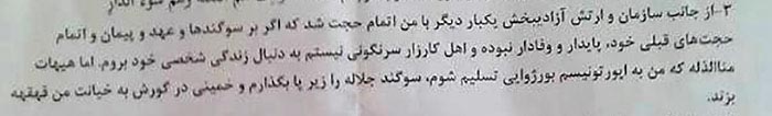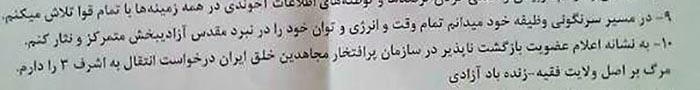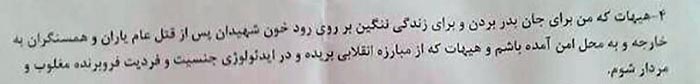 اما دم خروس آنجا بیرون می زند که سران فرقه رجوی در این تعهدنامه اعضا را وادر می کنند عضو خواهان جدایی را چنین توصیف کنند که خروجش از فرقه بدلیل «پایدار و وفا دار نبودن به تعهدات قبلی خودش» بوده و جدا شدنش به این دلیل است که «اهل کارزار سرنگونی نیست» و جدا شدن به این معناست که «تسلیم اپورتونیسم بورزوایی» شده و «سوگند جلاله اش» را زیر پا گذاشته است.