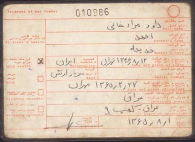 فرامرز (داود) مرادخانی فرزند احمد و خدیجه متولد 4/8/1346 درهنگامه خدمت مقدس سربازی درتاریخ 27/2/1365 بدست نیروهای متجاوز صدام ملعون به اسارت درآمد وبه اردوگاه 9 عراقیها هدایت شد.