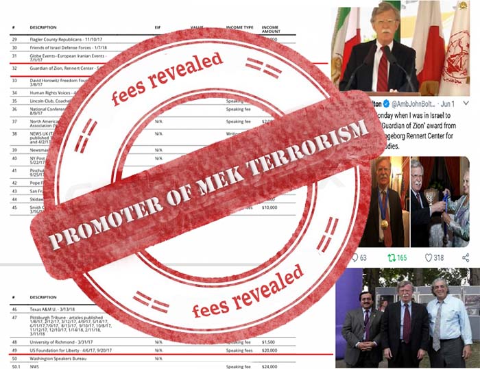 افشا شدن فهرست درآمدهای مشاور امنیت ملی امریکا، جان بولتون، نشان داد که سیاست مداران امریکایی تا چه حد تحت تأثیر مجاهدین خلق هستند و برای پنج دقیقه سخنرانی در مراسم آن ها هزاران دلار دریافت می کنند.