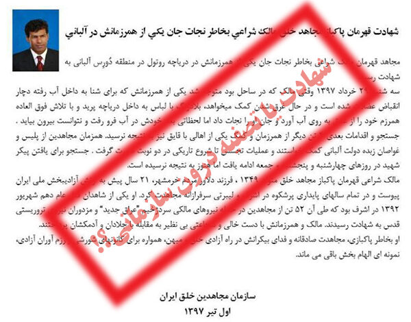 ضمن اینکه همه کسانی که مالک را میشناختند بخوبی میدانند که او شناگر ماهری بود و در آن دریاچه کوچک امکان نداشت که غرق شود. فرقه رجوی حتی احتمال فرار او را هم نداده است و فورا او را شهید مجاهد خلق اعلام کرده است.