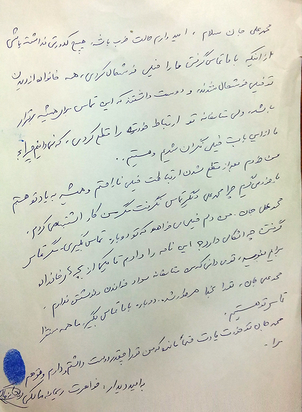 محمدعلی جان من دلم خیلی می خواهد که تو دوباره تماس بگیری مگر تماس گرفتن چه اشکالی دارد؟ این نامه را دادم تا یکی از بچه های خانواده برایم بنویسد تو می دانی که من متاسفانه سواد خواندن و نوشتن ندارم.