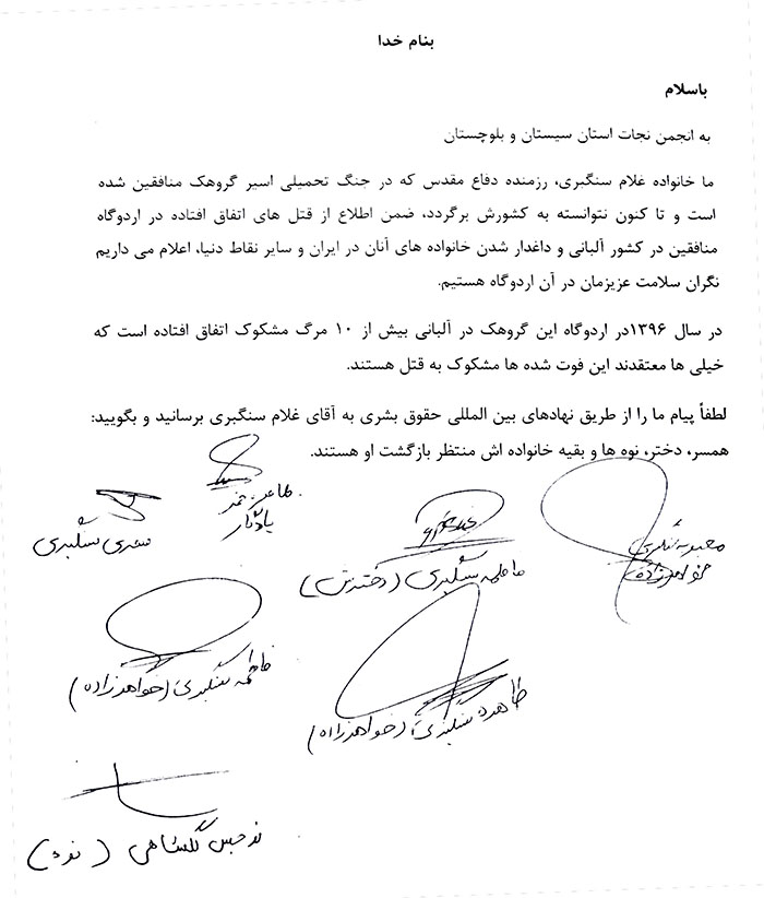 ما خانواده غلام سنگبری، رزمنده دفاع مقدس که در جنگ تحمیلی اسیر گروهک منافقین شده است و تا کنون نتوانسته به کشورش برگردد، ضمن اطلاع از قتل های اتفاق افتاده در اردوگاه منافقین در کشور آلبانی و داغدار شدن خانواده های آنان در ایران و سایر نقاط دنیا، اعلام می داریم نگران سلامت عزیزمان در آن اردوگاه هستیم.
