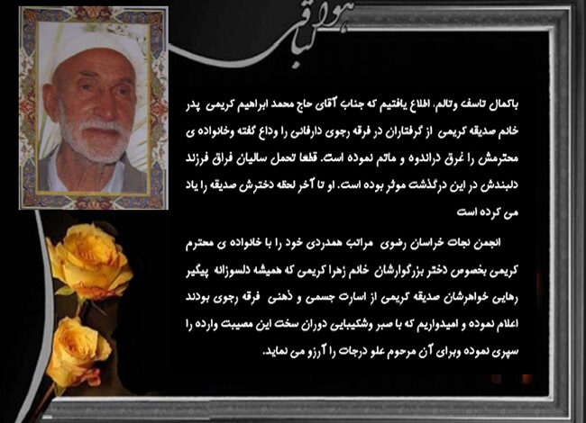انجمن نجات خراسان رضوی مراتب همدردی خود را با خانواده ی محترم کریمی بخصوص دختر بزرگوارشان خانم زهرا کریمی که همیشه دلسوزانه پیگیر رهایی خواهرشان صدیقه کریمی از اسارت جسمی و ذهنی فرقه رجوی بودند اعلام نموده و امیدواریم که با صبر وشکیبایی دوران سخت این مصیبت وارده را سپری نموده وبرای آن مرحوم علو درجات را آرزو می نماید.