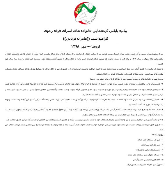 بعد از سخنرانی مسئول انجمن نجات، خانم شهیدی از بانیان تشکل «مادران قربانی» و از حامیان انجمن نجات، بیانیه ی اعلام موجودیت تشکل مادران، قربانیان فراموش شده فرقه رجوی در استان آذربایجان غربی را در جمع خانواده ها قرائت نمودند که مورد توجه حاضرین قرار گرفت.