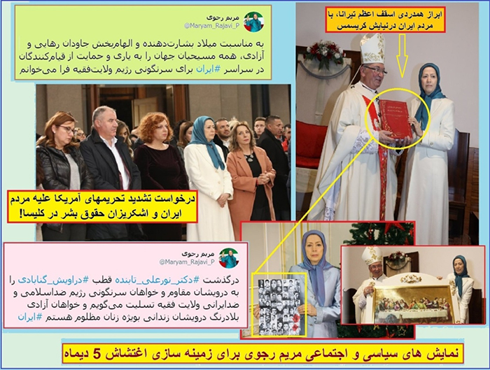 به مناسبت فرارسیدن تولد عیسی مسیح، مریم رجوی در نمایشی طنزآلود در کلیسا حاضر شد و ضمن گرفتن عکس های یادگاری با اسقف اعظم تیرانا، به فریب افکار عمومی این کشور مشغول گردید. به دست گرفتن تابلوی حواریون مسیح، اهداء کتاب به اسقف و پیام تبریک کریسمس و عکس یادگاری با درخت کاج و عکس کشته های تولیدی رخدادهای آبان، بخشی از نمایش فریب بود.