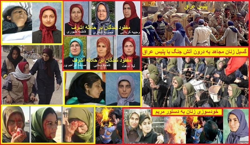 نهم) وادار کردن صدها زن مجاهد به ماندن در قرارگاه اشرف واقع در عراق و زمینه سازی برای کشتار وسیع آنان!. اصرار مستمر مریم رجوی برای حفظ قرارگاه اشرف به هرقیمت با شعارهای سخیف “اشرف حفظ شرف – چو اشرف نباشد تن من مباد” و همچنین گسیل صدها وکیل و لابی غربی برای مانع تراشی بر سر راه سازمان ملل برای خروج این نیروها از عراق، زمینه را برای خشم مردم این کشور (که صدها تن از فرزندانشان بخاطر حمایت رجوی از صدام کشته شده بودند) فراهم ساخت تا دست به اقدامات خشونت آمیز برای بیرون راندن مجاهدین از عراق بزنند. نتیجه این سیاست ضدانسانی و نابخردانه مریم، کشته و مفقود شدن دهها زن مجاهد در قرارگاه اشرف و لیبرتی بود.
