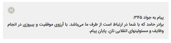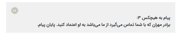 خانم X ( ایکس ) ، که سراغ شما آمده است از خودمان است ، اشکال ندارد در سوراخ موش با او همکاری کنید. پایان پیام “