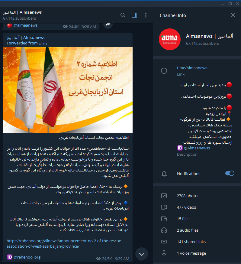 کانال تلگرامی پایگاه خبری تحلیلی فاطر24 نیز اطلاعیه انجمن نجات استان آذربایجان غربی را درج کرده است که نزدیک به 25000 بازدید داشته است.