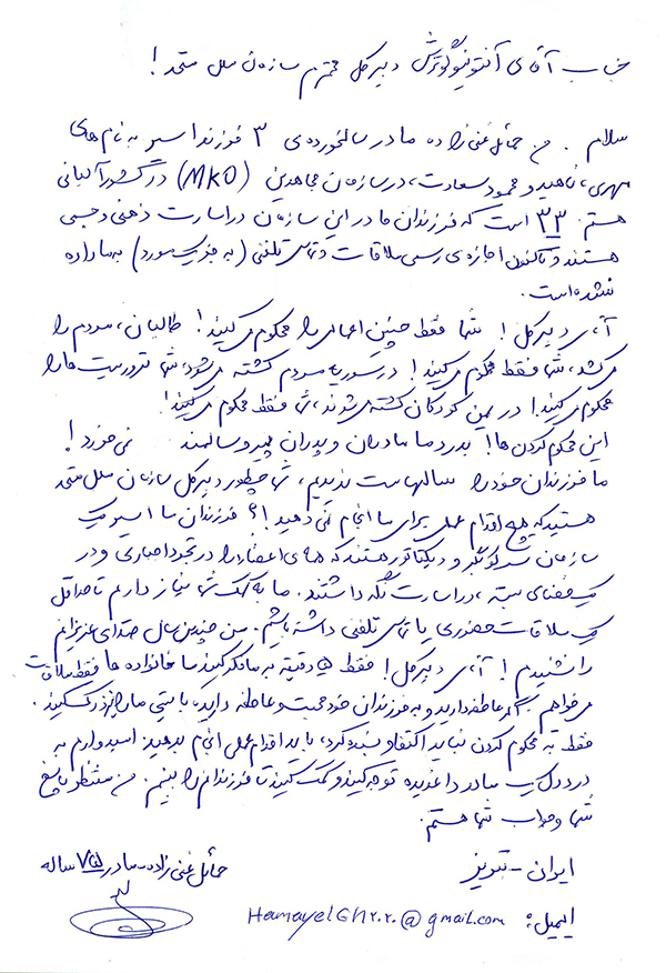 جناب آقای آنتونیو گوترش ، دبیرکل محترم سازمان ملل متحد! سلام، من حمائل غنی زاده مادر سالخورده ی 3 فرزند اسیر به نام های مهری ، ناهید ومحمود سعادت، در سازمان مجاهدین MKO در کشور آلبانی هستم .33 سال است که فرزندان ما در این سازمان در اسارت ذهنی و جسمی هستند و تا کنون […]