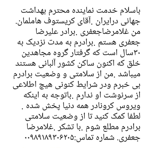 نامه خانواده جعفری به نماینده سازمان بهداشت جهانی درتهران در خصوص بررسی و روشن شدن وضعیت سلامتی فرزندشان علیرضا جعفری ساکن کشور آلبانی که اسیر دست فرقه رجوی می باشد .