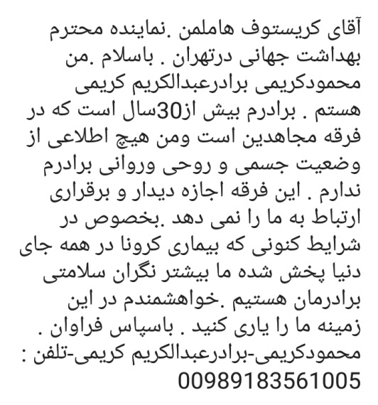 شکایت و دادخواست خانواده آقای کریمی به نماینده سازمان بهداشت جهانی درتهران درخصوص روشن شدن وضعیت برادرش عبدالکریم کریمی که نزدیک به 30 سال است از او بی خبر هستند واکنون هم با توجه به شیوع ویروس کرونا نگران سلامتی وی می باشند .