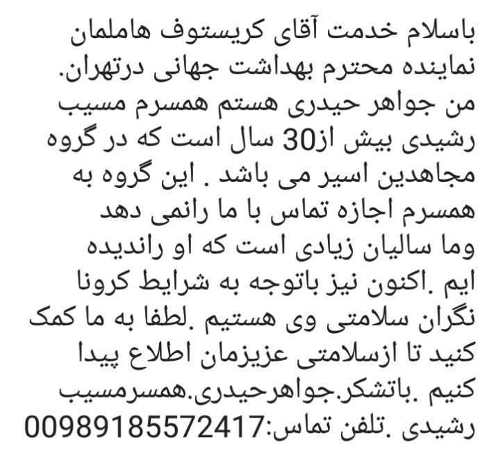 نامه و درخواست خانم جواهر حیدری همسر مسیب رشیدی اسیر در گروه مجاهدین خلق ساکن آلبانی به نماینده سازمان بهداشت جهانی در تهران و ابراز نگرانی این خانواده درخصوص وضعیت کنونی عزیزشان که اکنون بیش از 30 سال است از سرنوشت وی بی خبرهستند .