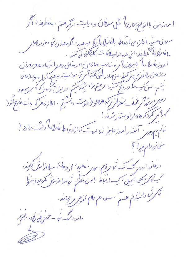 در خاتمه از روی تک تک شما می بوسم. مهری ، ناهید، محمود جان ، مرا فراموش نکنید، یک تماس، یک ایمیل ، یک ارتباط ! من مطمئنم شما مرا فراموش نکردید و منتظر تماس شما دلبندانم هستم، مسعود هم سلام مخصوص می رساند.