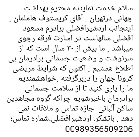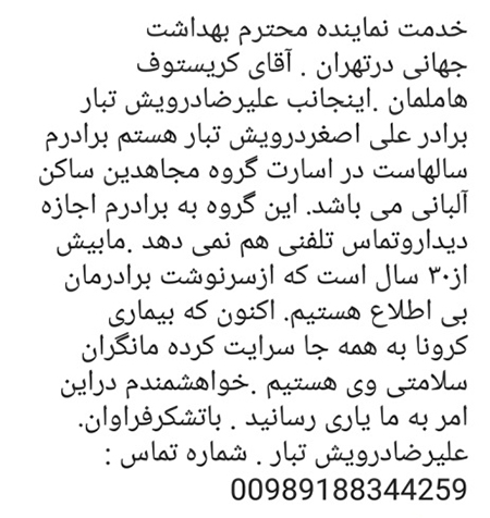 آقای درویش تبار درنامه ای به نماینده سازمان بهداشت جهانی درتهران، خواستار رسیدگی به وضعیت برادرش علی اصغر درویش تبار اسیر فرقه مجاهدین که اکنون ساکن کشور آلبانی ست شده است .