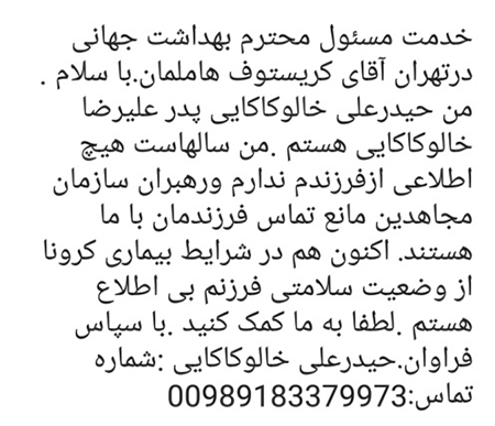 درخواست آقای خالوکاکایی از نماینده سازمان بهداشت جهانی در تهران