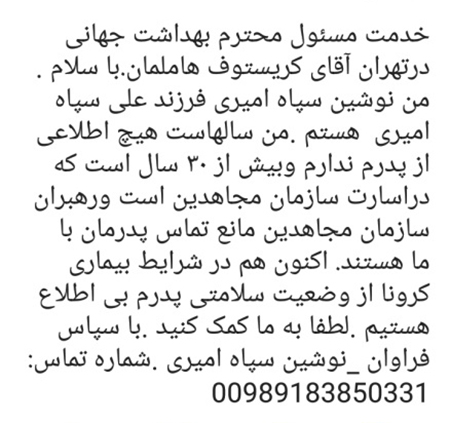 خانم سپاه امیری دراین نامه خواستار رسیدگی سازمان بهداشت جهانی به وضعیت پدرش در کمپ مجاهدین درکشور آلبانی شده و اشاره نموده که بیش از 30 سال است که از سرنوشت پدرش بی اطلاع است .