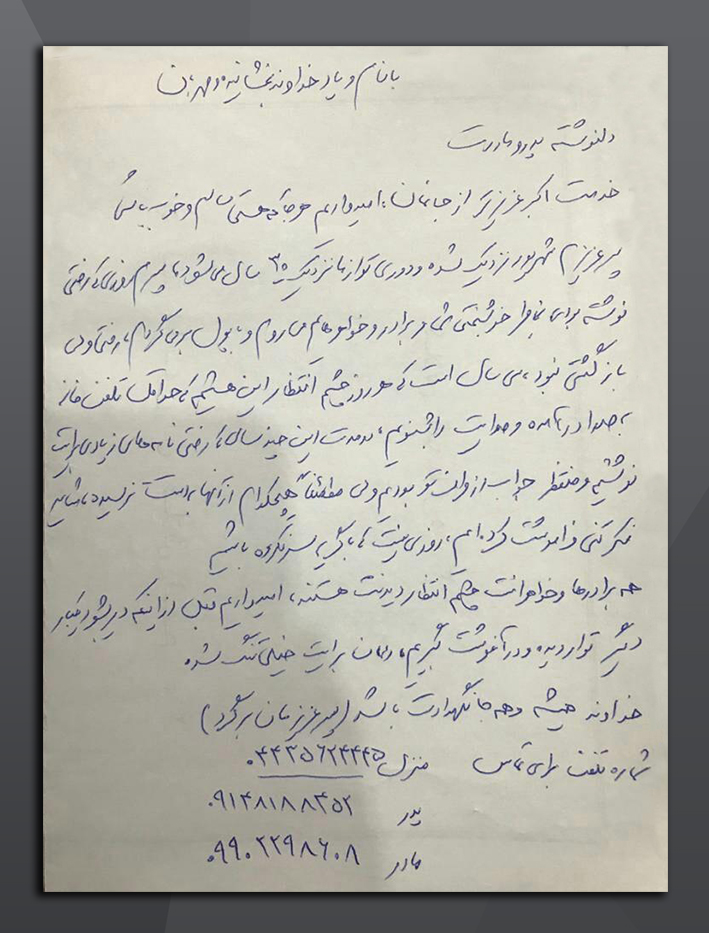 پسر عزیزم شهریور نزدیک شده و دورری تو ازما نزدیک ۳۰ سال می شود. پسرم روزی که رفتی نوشتی برای خاطر خوشبختی شما و برادر و خواهرهایم می روم و با پول برمی گردم. رفتی ولی بازگشتی نبود. سی سال است که هر روز چشم انتظار این هستیم که حداقل تلفن خانه به صدا در آمده و صدایت را بشنویم. در مدت این چندسالی که رفتی نامه های زیادی برایت توشتیم و منتظر جواب از طرف تو بودیم ولی مطمئنا هیچکدام از آنها بدستت نرسیده، شاید فکر کنی فراموشت کردیم ، ورزی نیست که با گریه سرنکرده باشیم.