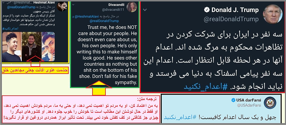 جهت اطلاع، پس از انتشار توئیت ترامپ و وزارت خارجه آمریکا، مجاهدین خلق نیز با اکانت جعلی به میدان آمدند و از ترامپ بخاطر موضعگیری تشکر کردند (اکانت «حشمت علوی» که چند ماه قبل توسط مجاهدین تولید شده، برای بیان مواضعی است که سران فرقه رجوی قادر به ابراز آن به صورت علنی نیستند و از آن برای نظرات غیر رسمی استفاده می کنند). این موضعگیری به حدی چندش آور بود که برخی آمریکایی ها آنرا نکوهش کردند. یک خانم آمریکایی به صراحت به این اکانت جعلی مجاهدین گفته بود: «به من اعتماد کن، او به مردم تو اهمیت نمی دهد، او حتی به ما، مردم خودش اهمیت نمی دهد، او فقط در حال نوشتن این مطالب است تا خودش را خوب جلوه دهد. او کشورهای دیگر را چیزی جز کثافتی در کف کفش خود نمی بیند. تحت تأثیر ابراز همدردی دروغین او قرار نگیرید!».