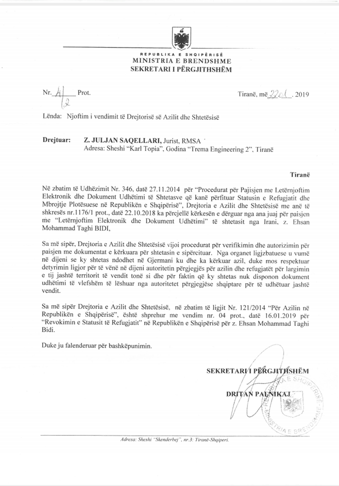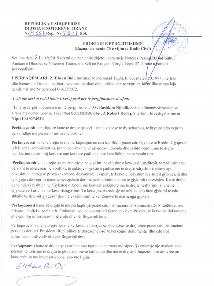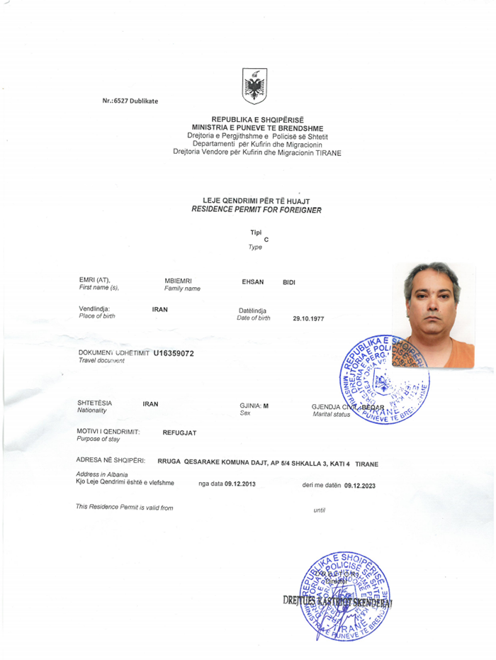 در حال حاضر وی آزاد و در تیرانا پایتخت آلبانی اقامت دارد. حال آقای محمد تقی بیدی پدر احسان با در دست داشتن مدارک پناهندگی وهمچنین مدارک قانونی اقامت 10 ساله فرزندش در کشورآلبانی ، با مراجعه به دفتر انجمن استان تصاویر مدارک فوق را همراه دست نوشته ای از قبل تنظیم شده جهت ترجمه و ارسال آن به پست الکترونیکی وزیر کشور آلبانی تقدیم انجمن و از توطئه های آینده فرقه علیه فرزندش ابراز نگرانی نموده و وزارت کشور و دیگر مقامات این کشور را مسئول حفاظت جان پسر خود میداند. آقای بیدی وزیر کشورآلبانی را به عنوان بالاترین مقام این کشور، مخاطب اصلی نامه خود قرارداده و وی را از خطرات و دسیسه های فرقه رجوی علیه فرزندش درآینده مطلع و از وزارت کشور تقاضا داشته به وی اجازه دیدار با فرزندش در کشور آلبانی و یا کشوری ثالث بدهند تا بتواند فرزندش را بار دیگر درآغوش بکشد.