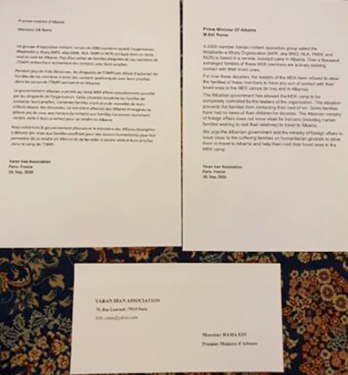 در حالی که وزارت کشور آلبانی که مسئول ساکنین خارجی در آلبانی است هیچ ردی از اسامی اعضای مجاهدین خلق در کشور ندارد، سفارتخانه های آلبانی لیستی از اسامی خانواده ها را در اختیار دارند تا از صدور ویزا جلوگیری کنند. طومار ضمیمه با بیش از یازده هزار امضاء خطاب به دولت شما خواستار پایان دادن به این ممنوعیت دسته جمعی علیه خانواده هاست تا آنها بتوانند با سفر به آلبانی به کمک عزیزان گرفتارشان بشتابند.