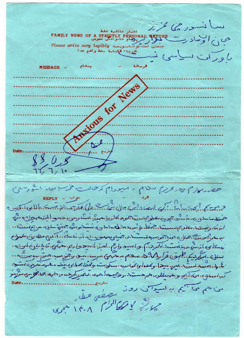 مصطفی جان عزیز خواهر و تنها برادرم ، امید به زندگی و آینده مسرت بخش است و من نیز با امید به دیدار و ارتباط تلفنی و دریافت نامه از تو مانند گذشته که اسیر زندانهای صدام ملعون بودی برایت مینویسم.