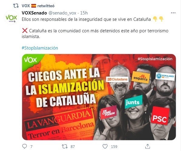 در این توییت که تصویری کاملاً عادی از یک خانواده مسلمان را نشان میدهد این متن نوشته شده است: «اسلامگرایی در شهر ژیرونا 5 درصد در یک سال افزایش یافته و تعداد مسلمانان را به 90 هزار نفر رسانده است. سبک زندگی ما از سوی پروسه اسلامی شدن کاتالونیا مورد تهدید است. مثل دیواری مانع آنها خواهیم شد».
