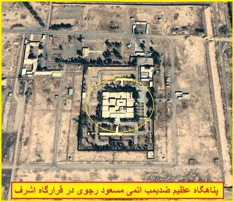 “سازمان در نهایت توانست منطقۀ مناسبی را در داخل قرارگاه اشرف شناسایی و پناهگاه ضد بمب را برای رجوی در آن منطقه بسازد. این پناهگاه در تقاطع خیابانهای 100 و 400 قرارگاه اشرف و روبروی تصفیه خانۀ آب قرارگاه ساخته شد.”