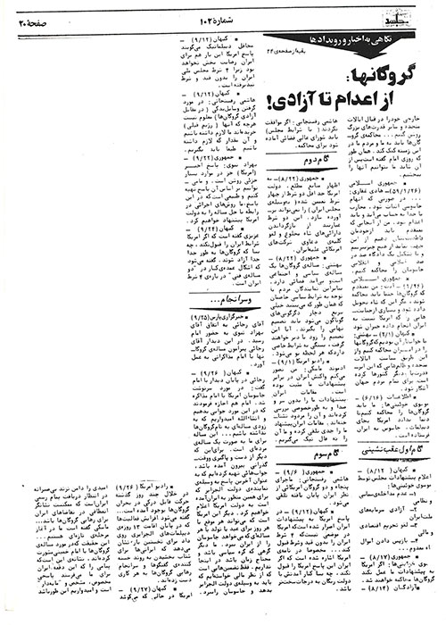 نشریه مجاهد شماره 102 در صفحات 20 و 24 مطلبی تحت عنوان “گروگان ها از اعدام تا آزادی!” درج نمود و به نقد مماشات در برابر گروگان های آمریکایی پرداخت. در این مقاله طلبکاری شده است که پس اعدام آنان چه شد؟