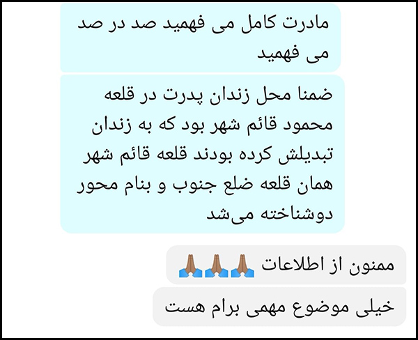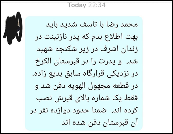 «28 سال از مرگ پدرم میگذرد و تنها به تازگی از محل دفنش با خبر شدم. نه از مادر و عمههای «مجاهدم» و نه از کسانی که مرتکب چنین جنایتی شدند، بلکه از شاهدین صحنه. ناگفته نماند که تنها 5 سال پس از مرگش، یعنی هنگام ورودم به پایگاه مجاهدین در عراق در سال 1999 خبر مرگش را شنیدم. و باید این را هم تاکید کنم که تنها 23 سال پس از مرگش، یعنی در سال 2017، و هنگامی که از سازمان مجاهدین خارج شدم فهمیدم که چطور و به دست چه کسانی کشته شد. یک عمر شنیدن دروغ از مادر «مجاهدم» تا کسانی که خود را انقلابی و گوهر بی بدیل مینامند.»