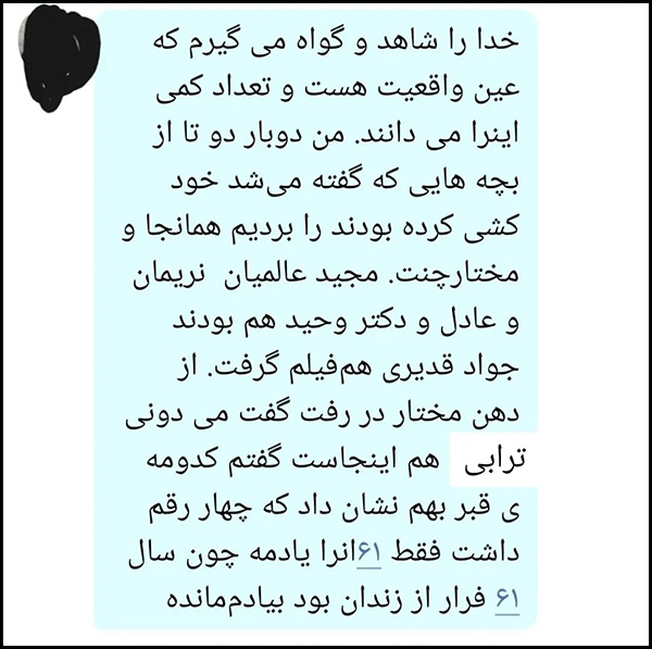 محمد رضا ترابی تصاویری از متن پیامهایی که یکی از شاهدین درباره چگونگی قتل پدرش و محل دفن او برای او ارسال کرده است، ضمیمه متن خود کرده است. در این پیام از افرادی یاد شده است که بر شواهد پیشین جدا شدهها درباره قتل قربانعلی ترابی منطبق است. از مختار جنت، مجید عالمیان، نریمان، عادل و دکتر وحید نام میبرد که از محل دفن قربانعلی در گورستان الکرخ در نزدیکی قرارگاه بدیع زادگان آگاه بودند و کارشان دفن کردن افرادی بود که گفته میشد خودکشی کردهاند!