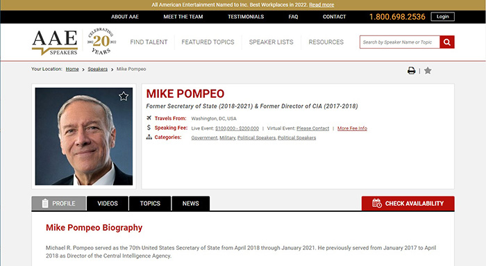در خبرها آمده است که مایکل پمپئو وزیر خارجه سابق آمریکا و رئیس اسبق سازمان سیا CIA در سفری به آلبانی، دیداری با مریم رجوی در مقر فرقه ای سازمان مجاهدین خلق در این کشور داشته است. قبل از ورود به هر بحث و تحلیلی بهتر است سری به آگهی مایک پمپئو در یک سایت تبلیغی آمریکایی و اعلام دستمزدش جهت شرکت در مراسم و سخنرانی بزنیم: