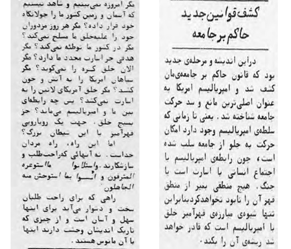 در قسمت هایی از صحبت های عباس داوری در مورد کشف قوانین جدید و حاکم بر جامعه عنوان شد: امپریالیسم آمریکا به عنوان اصلی ترین مانع و سد حرکت جامعه شناخته می شود . یعنی تا زمانی که سلطه امپریالیسم وجود دارد امکان حرکت به جلو از جامعه سلب می شود. چون نتیجه رابطه امپریالیسم با اجتماع انسانی یا اسارت است یا جنگ . تنها شیوه، مبارزه قهر آمیز خلق با امپریالیسم است که قادر خواهد شد ریشه آن را بخشکاند. مگر الان خلق کره را نمی کوبد مگر خلق آمریکای لاتین را به اسارت نمی کشد پس چه رابطه ای بین ما و امپریالیسم می ماند؟ جز بسیج خلق جهت یک رویارویی قهر آمیز با این شیطان بزرگ و ….