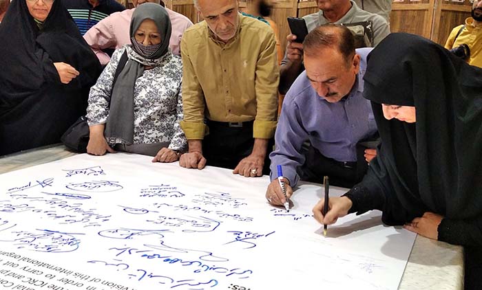 خانواده علی مدد صادقی در حال امضا طومار