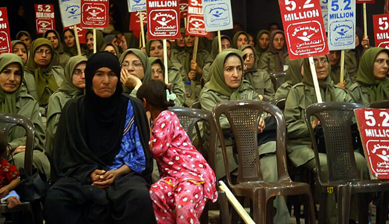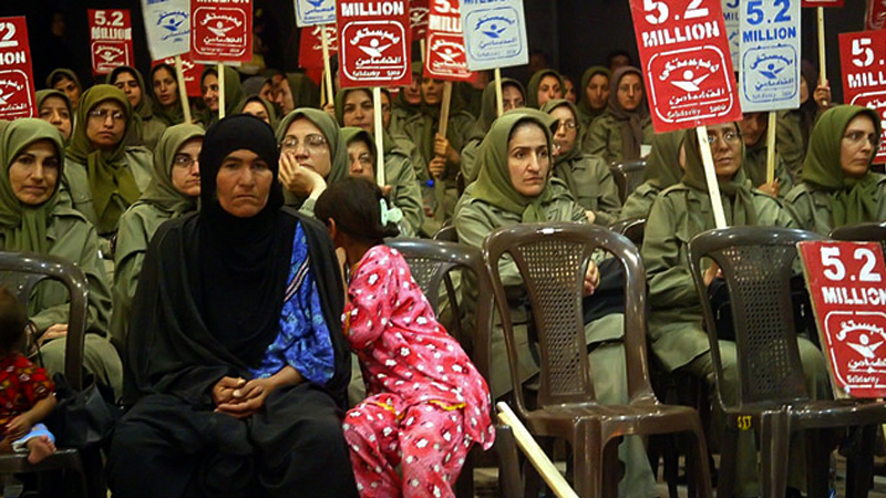 در حالی که زنان عضو سازمان مجاهدین با یونیفورم نظامی صف کشیدهاند و پلاکاردهایی در دست دارند که ادعا میکند ۵.۲ میلیون عراقی از آنها حمایت کردهاند، زنی عراقی با چادر سیاه در گوشهای نشسته. نه پلاکارد دارد، نه شعار. فقط نگاه میکند.