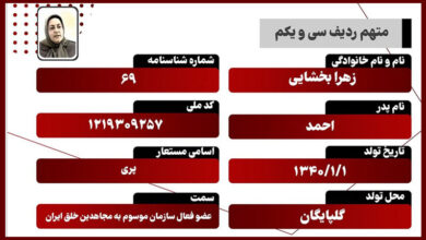 زهرا بخشایی فرزند احمد متهم ردیف سی و یک دادگاه رسیدگی به جرایم گروه تروریستی مجاهدین خلق است، وی در سال ۱۳۶۰، به دلیل عضویت و همکاری با گروه تروریستی مجاهدین خلق دستگیر و به یک سال حبس محکوم میشود. نامبرده پس از آزادی از زندان، با یکی از مجاهدین گلپایگان به نام محسن عزیزی […]
