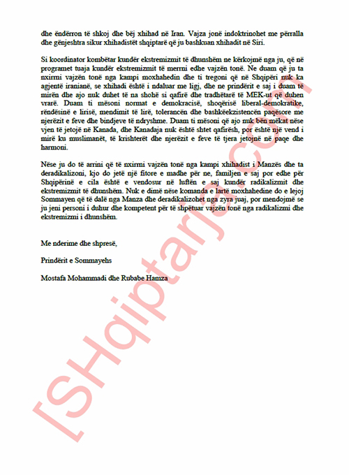 Si koordinator kombëtar kundër ekstremizmit të dhunshëm ne kërkojmë nga ju, që në programet tuaja kundër ekstremizmit të merrni edhe vajzën tonë. Ne duam që ju ta nxirrni vajzën tonë nga kampi moxhahedin dhe ti tregoni që në Shqipëri nuk ka agjentë iranianë, se xhihadi është i ndaluar me ligj, dhe ne prindërit e saj i duam të mirën dhe ajo nuk duhet të na shohë si qafirë dhe tradhëtarë të MEK-ut që duhen vrarë. Duam ti mësoni normat e demokracisë, shoqërisë liberal-demokratike, rëndësinë e lirisë, mendimit të lirë, tolerancën dhe bashkëekzistencën paqësore me njerëzit e feve dhe bindjeve të ndryshme. Duam ti mësoni që ajo nuk bën mëkat nëse vjen të jetojë në Kanada, dhe Kanadaja nuk është shtet qafirësh, por është një vend i mirë ku muslimanët, të krishterët dhe njerëzit e feve të tjera jetojnë në paqe dhe harmoni.